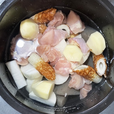 材料は、おでんの具。鶏肉を入れるとボリューム感が増します。